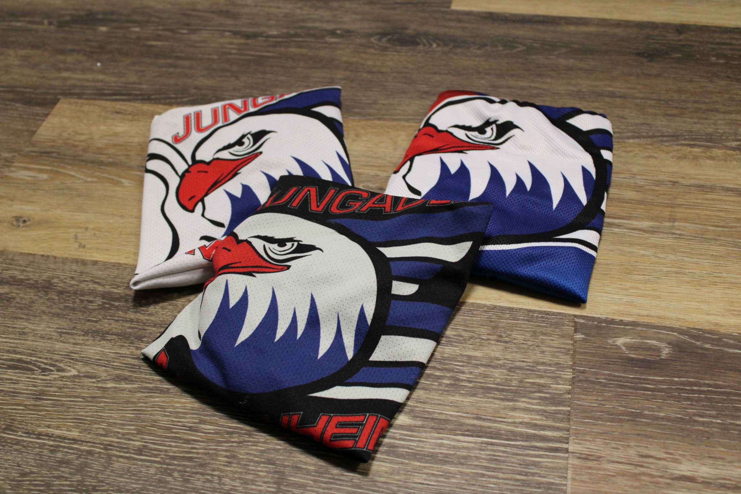 Nikolaussocke aus alten Spiel- und Trainingstrikots in verschiedenen Farben.